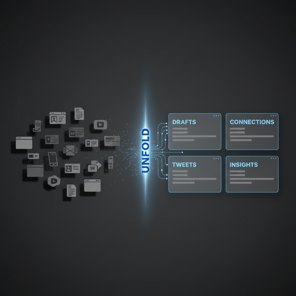 Unfold captures what you read, connects the dots with AI, and unfolds it into outlines, threads, and drafts you can ship.